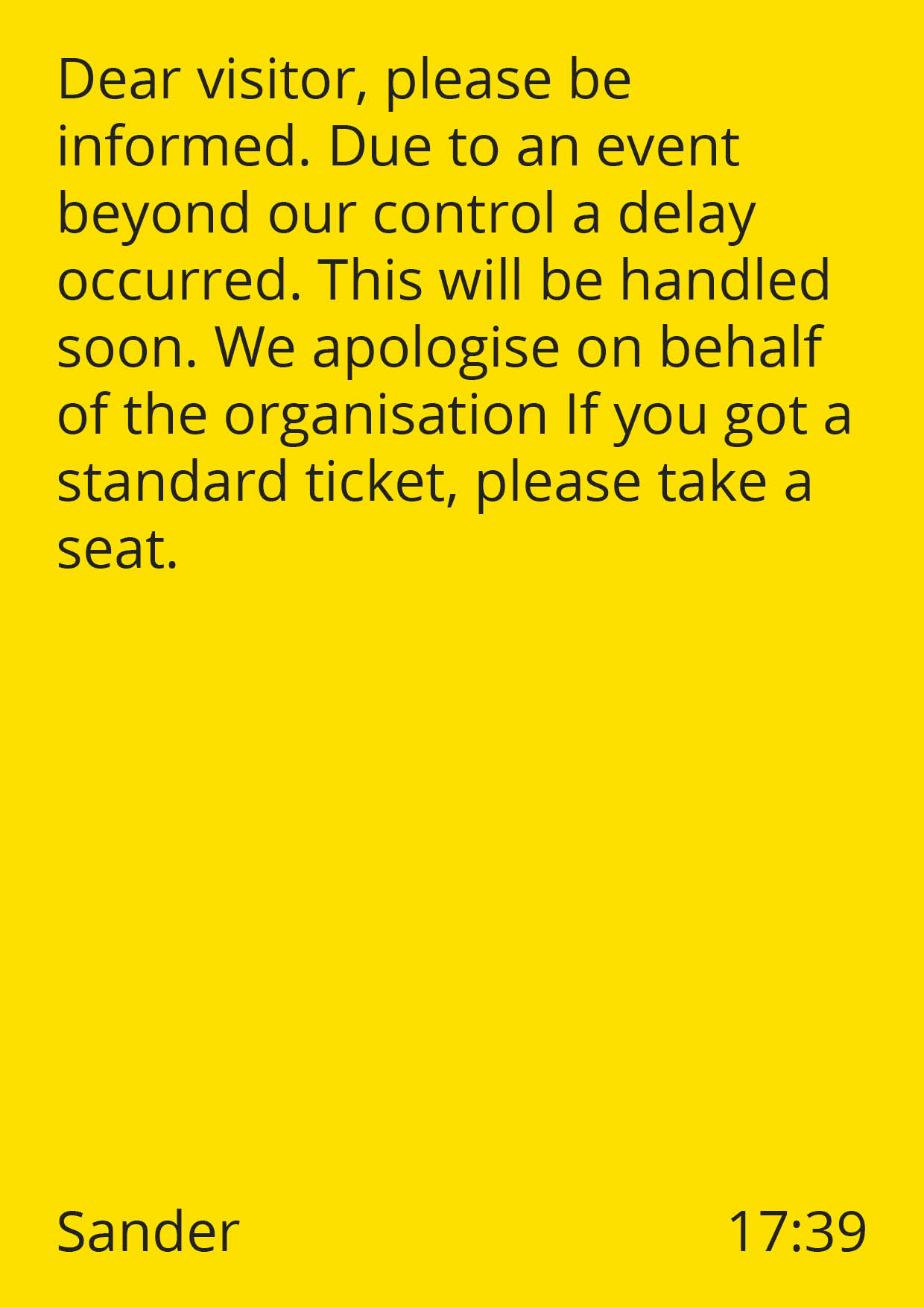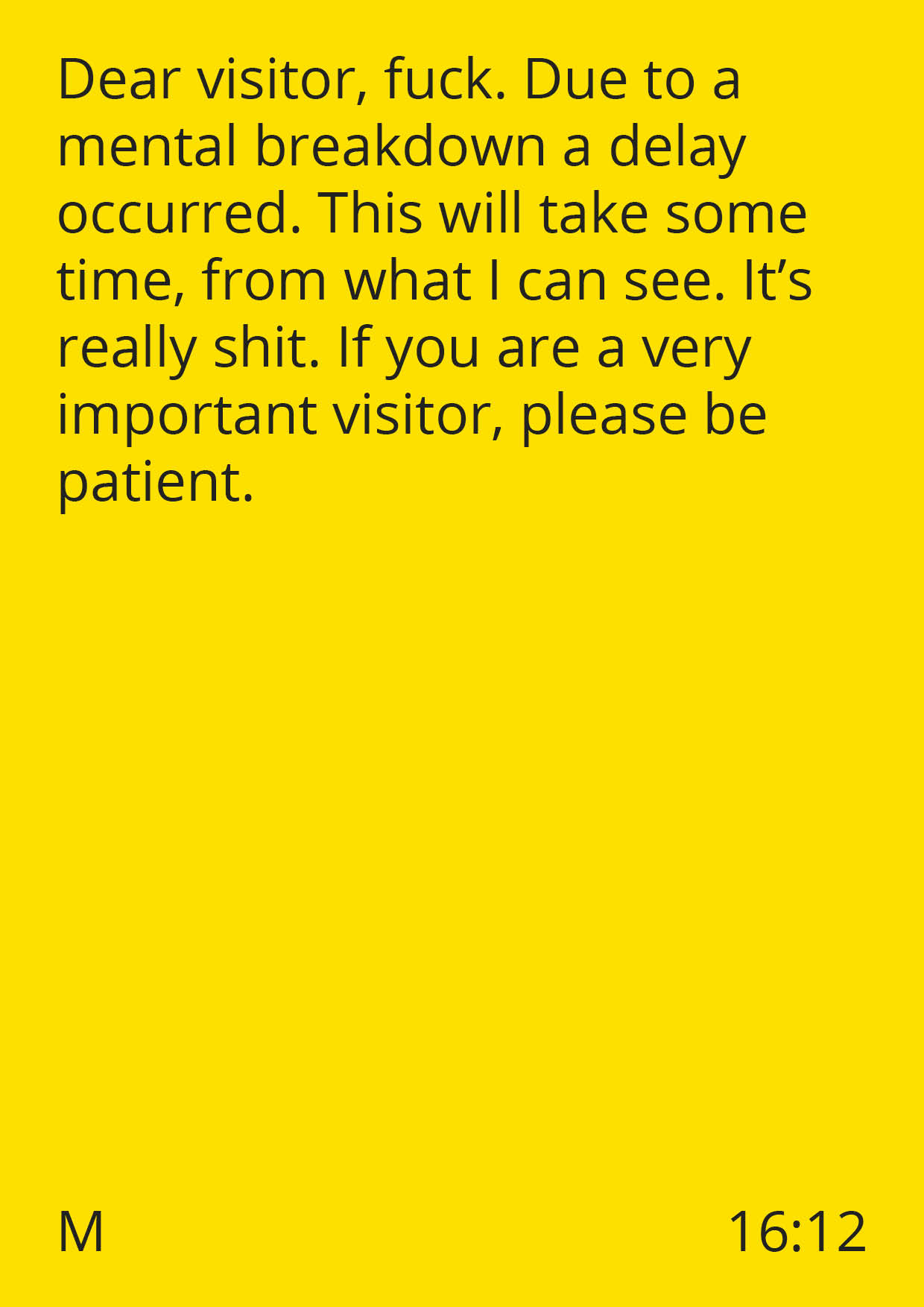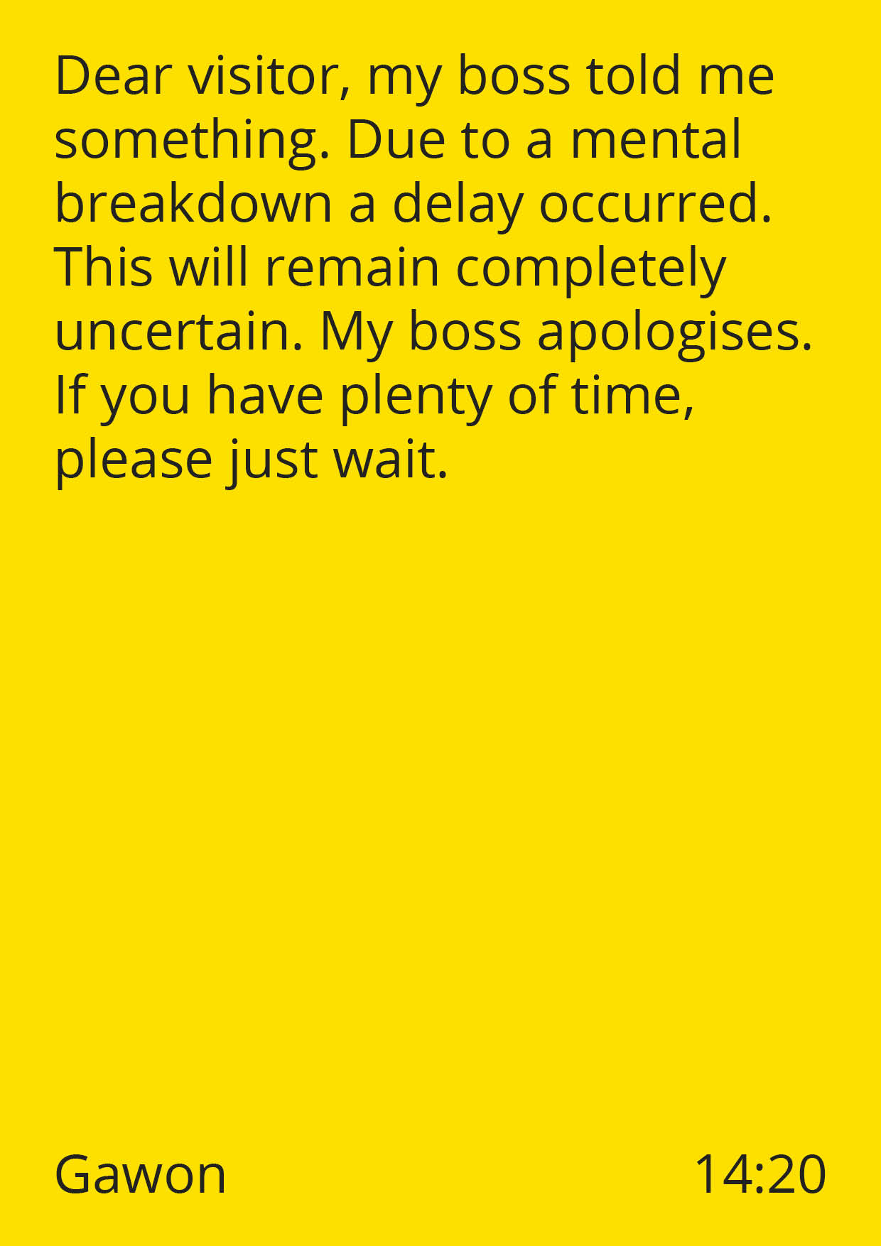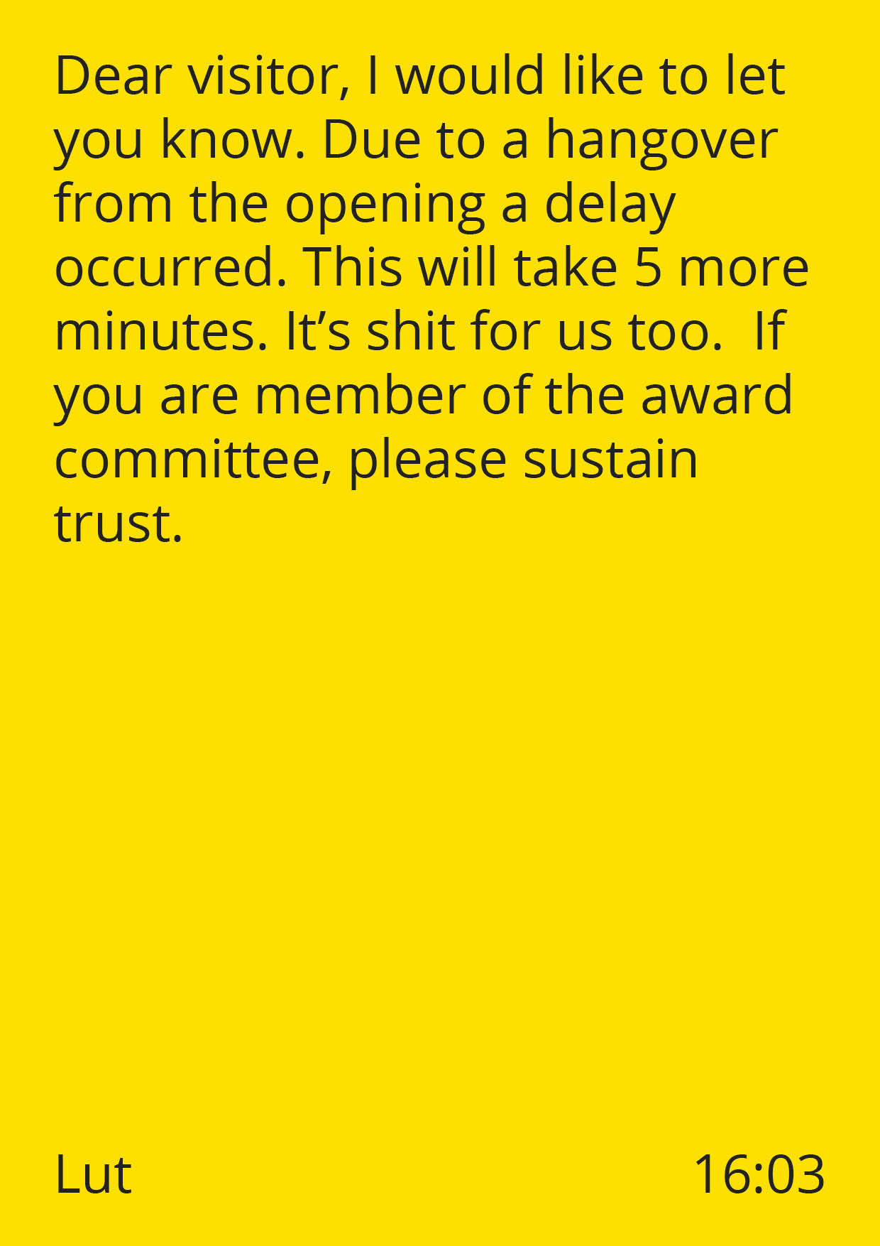The project Thank You for Your Patience aims to challenge this waiting dynamic between a system and its user. On a digital platform, people are invited to contribute alternative delay announcements. These submitted delay announcements are then broadcast in a place for waiting, evoking a range of emotions from confusion to joy and frustration. Through this interactive experience, the project prompts a playful reflection on our reliance on institutions and systems.